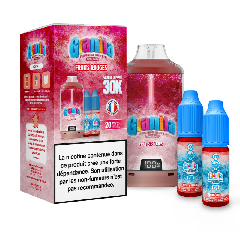 La conception de la Puff 30K Fruits Rouges Granita reflète le savoir faire d’Alfaliquid. Les matériaux sont robustes, la finition est soignée et le design reste sobre et efficace. Elle se transporte facilement et s’utilise aussi bien à domicile qu’en déplacement.