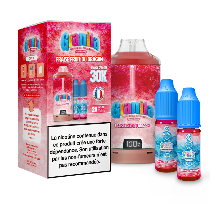 La Puff 30K Fraise Fruit du Dragon Granita Alfaliquid s’impose comme une référence incontournable dans l’univers des puffs longue durée. Pensée pour offrir une autonomie exceptionnelle et une expérience gustative constante elle combine le savoir faire d’Alfaliquid à un format ultra pratique destiné aux vapoteurs exigeants.