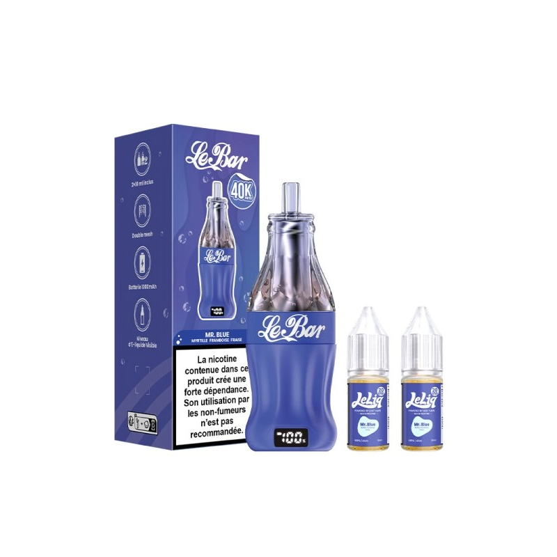 Le Starter Kit 40K Mr. Blue LeBar est une cigarette électronique jetable nouvelle génération pensée pour les vapoteurs à la recherche d’autonomie maximale, de simplicité d’utilisation et d’une saveur fruitée fraîche parfaitement équilibrée. Ce Starter Kit 40K signé LeBar combine une batterie rechargeable performante et un réservoir prérempli de 20 ml, permettant d’atteindre jusqu’à 40 000 bouffées selon l’usage. Il s’adresse aussi bien aux vapoteurs réguliers qu’aux anciens fumeurs souhaitant une solution clé en main, sans réglage ni entretien.