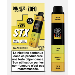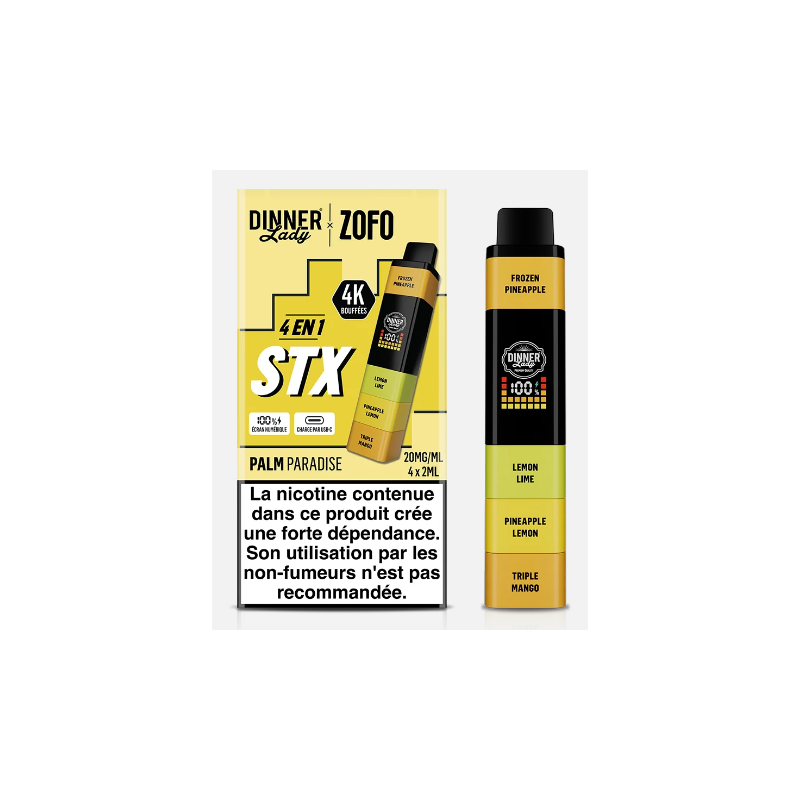 Le kit 4 en 1 STX Palm Paradise Dinner Lady s’impose comme une solution innovante pour les vapoteurs à la recherche de simplicité, d’autonomie et de saveurs maîtrisées. Conçu par la marque reconnue Dinner Lady, ce dispositif compact propose une expérience complète grâce à son système ingénieux 4 en 1, permettant de profiter de plusieurs saveurs au sein d’un seul appareil. Le modèle Palm Paradise se distingue par son profil aromatique exotique, parfaitement équilibré, qui associe des notes fruitées et fraîches pour une vape agréable tout au long de la journée.